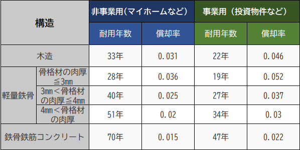 続いて「耐用年数」から「償却率」を算出します。耐用年数とは、使用できる期間です。上の表を見ると、木造マイホームの耐用年数は33年。「33年で使用できなくなる」ということではありませんが、税制上このように決められているのです。
