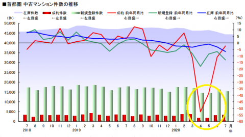 上記をご覧いただけると一目瞭然ですが、2020年4月に発令された緊急事態宣言の影響で首都圏中古マンションの成約数は大幅減に。これは、中古戸建や近畿圏の不動産流通にも見られた傾向です。