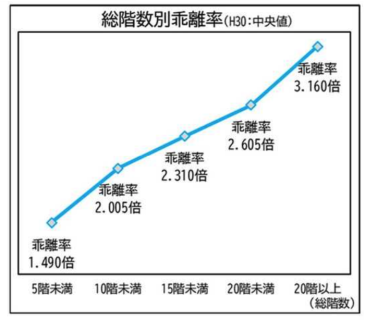 従ってこちらのグラフのように、階数が高いマンションであるほど時価と評価額の乖離(差)は大きくなります。