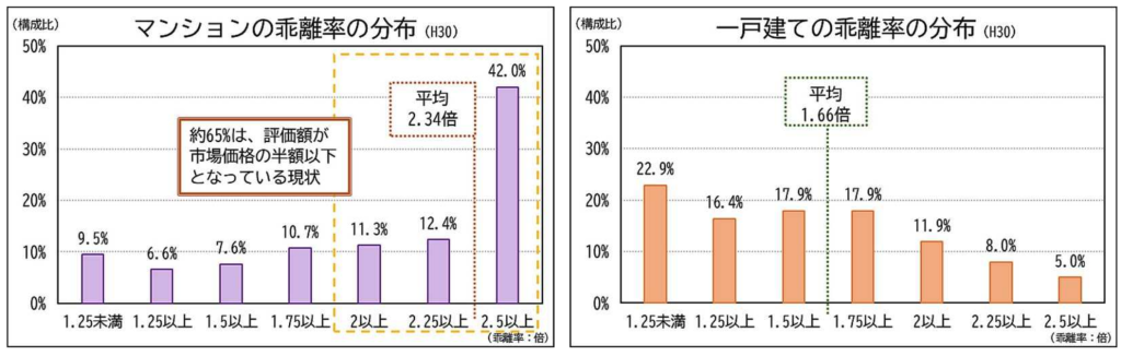 時価と相続税評価額の差の平均は、一戸建てが1.66倍である一方、マンションは2.34倍となっています。つまり、一戸建ての相続税評価の平均は時価の60%程度ですが、マンションの平均は40%強程度ということです。