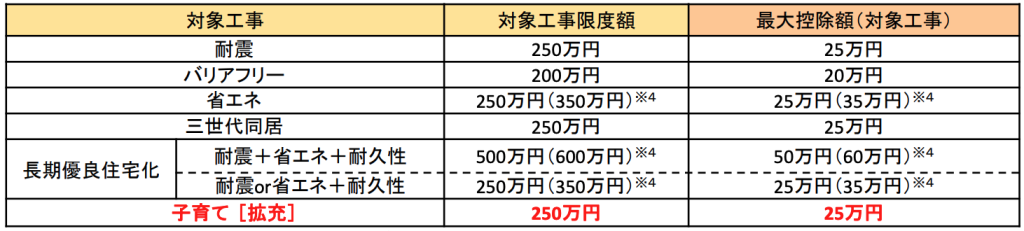 こちらも子育て世帯および若者夫婦世帯に限り、リフォームにかかる所得税の特例措置が拡大します。これまで控除の対象となっていたリフォームは次の通りですが、これらに加え「子育てに対応した住宅へのリフォーム」が加わります。