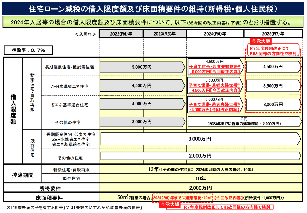 注目されていた住宅ローン減税は、19歳未満の子を有する子育て世帯および夫婦のいずれかの年齢が40歳未満の若者夫婦世帯に限り、2024年の借入限度額は23年のものが据え置かれます。