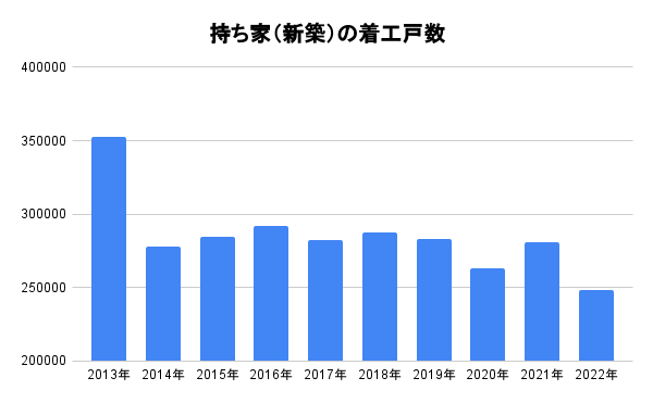 新築住宅の着工数は、年々、減少傾向にあります。直近では2021年に大きく増加しましたが、これはコロナ禍で住み替え需要が拡大したためです。