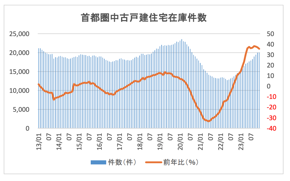2023年からは、在庫物件数が急激に増加しています。在庫物件数とは、売り出しているにも関わらず売れていない物件を指します。