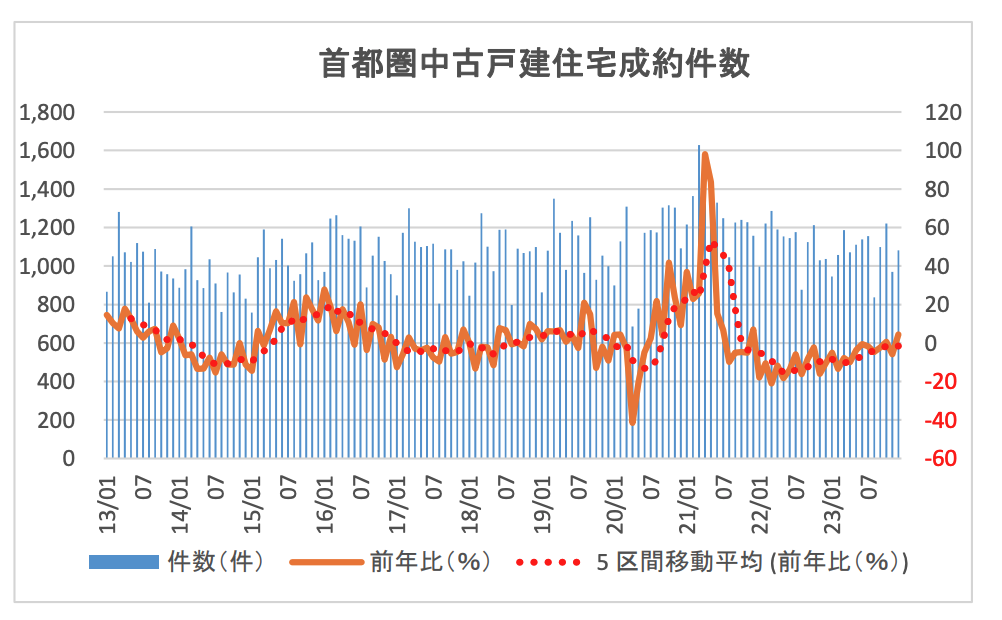 中古一戸建てもコロナ禍の住み替え需要で大きく成約数を伸ばしましたが、それも2021年がピークで、2022年頃からは潮目が変わってきているようです。