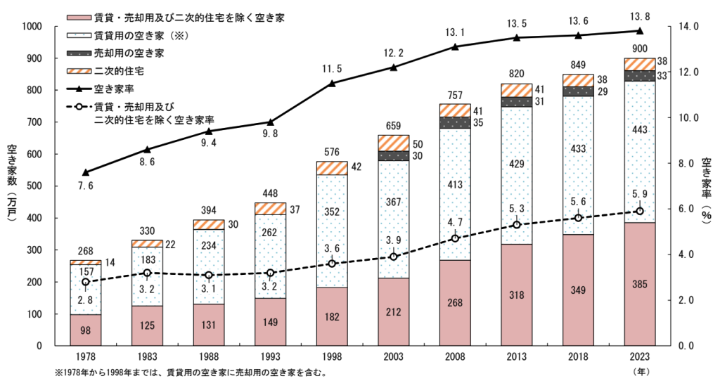 2023年10月現在の全国の空き家の数は900万戸、住宅総数のうち空き家の占める割合を示す空き家率は13.8%です。空き家率が最も高い都道府県は、21.2%の和歌山県と徳島県となっています。