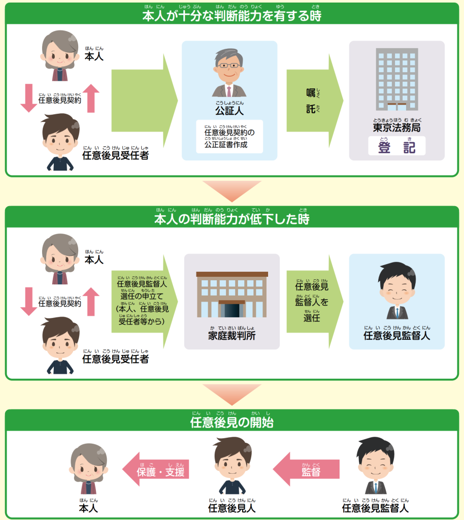 意志能力が欠如した場合は「委任」はできないものの、「後見人」を立てることは可能です。意志能力が無い方が後見人を立てるには、法定後見制度を利用することになります。